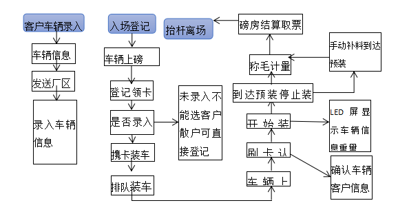 拉料車輛到進(jìn)場地磅,到磅房登記取貨信息,磅房操作員正在系統(tǒng)中輸入車牌,選客戶(判斷授權(quán)車輛),拉運料類,預(yù)裝重量等。登記成功后,司機(jī)拿ic卡入場裝車,否則不能登記,聯(lián)系客戶添加車輛信息。
